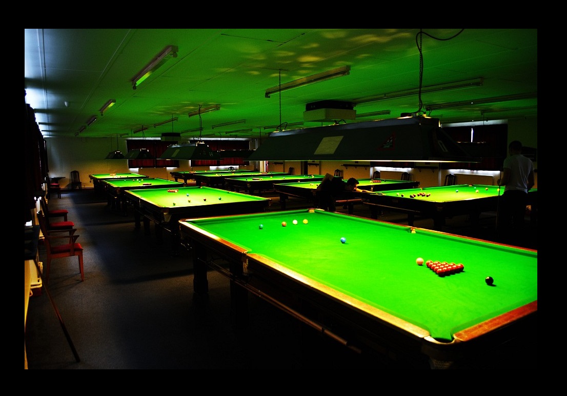 The bar lady dings a little bell, calls last orders. The entire pool hall is black now apart from a circle of yolk-coloured light around our table.