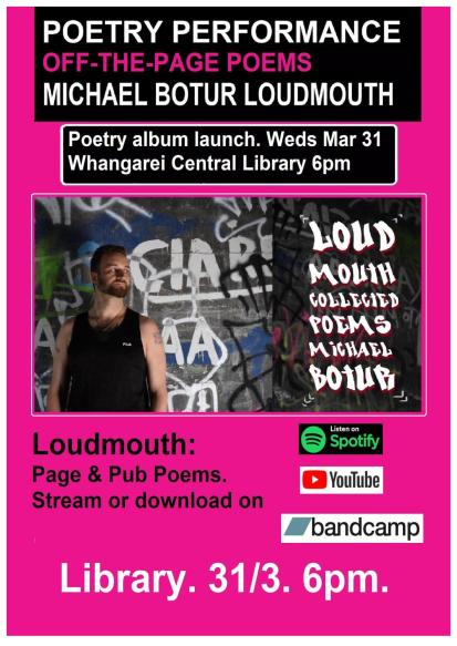 If you’re in Northland NZ, come enjoy the poems live as I deliver Loudmouth – Page & Pub Poems at Whangarei Central Library, 6pm-7.30pm March 31.